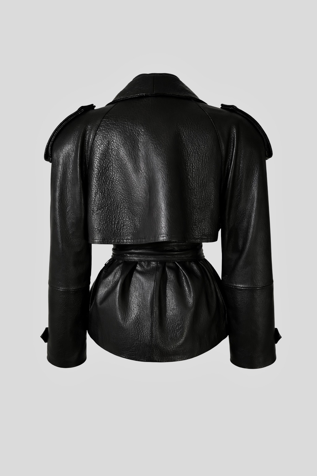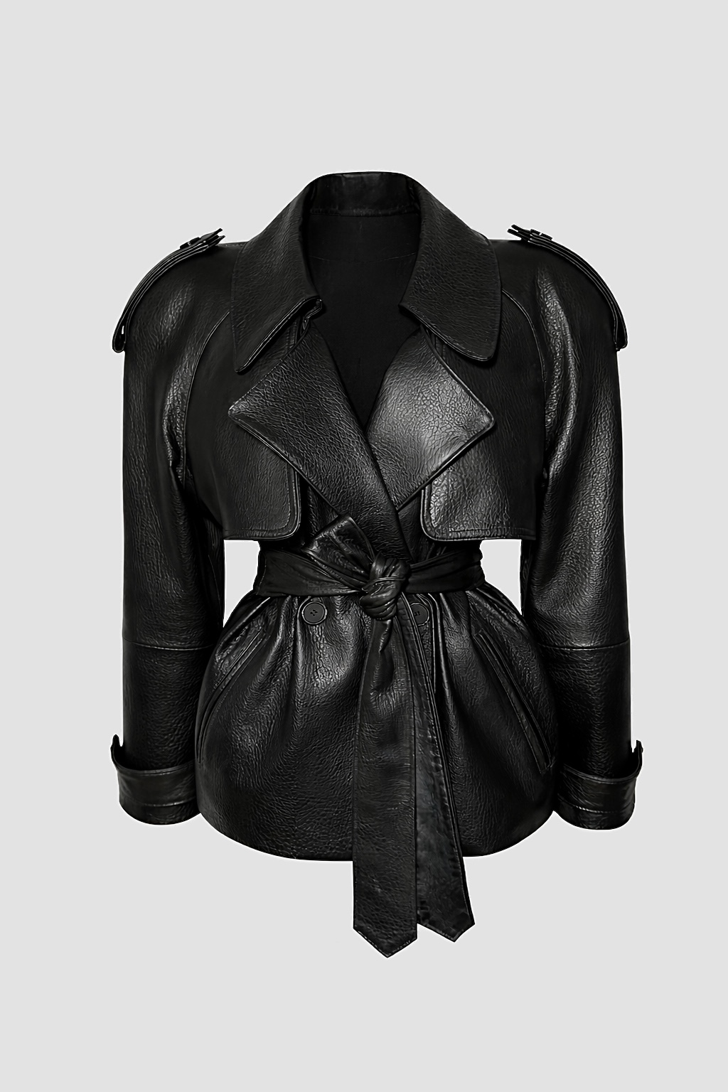 Krótki skórzany trench, który łączy klasyczną formę z nowoczesną sylwetką. Wyraziste klapy i pasek w talii podkreślają kobiecą linię i nadają całości charakteru. Naturalna skóra z subtelnym tłoczeniem sprawia, że model wygląda szlachetnie i ponadczasowo.