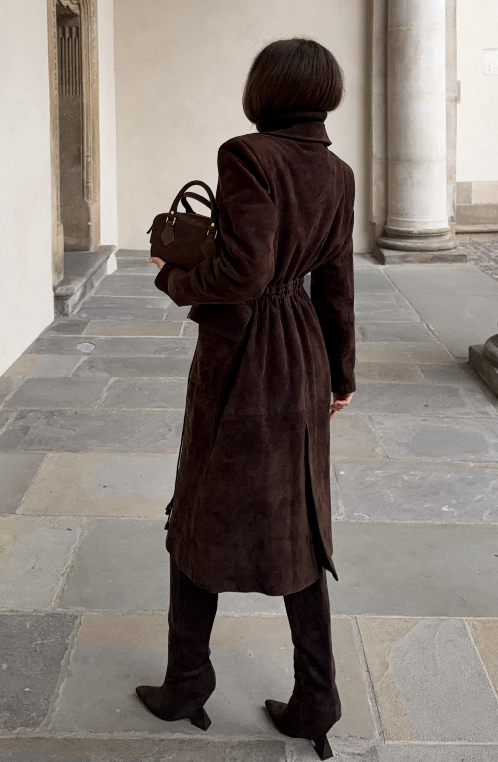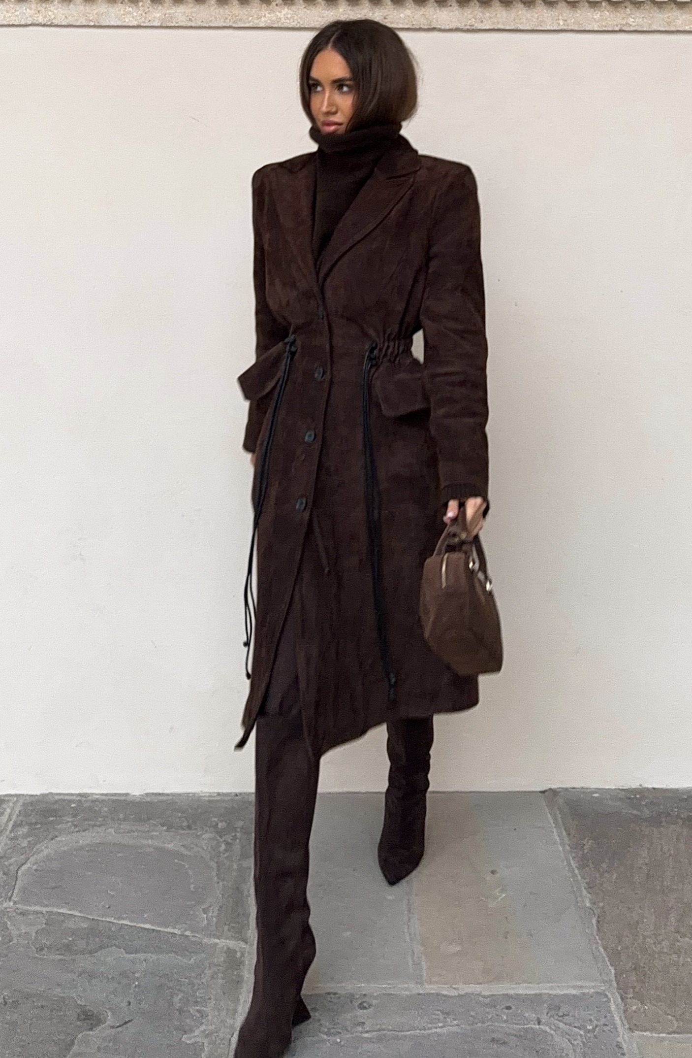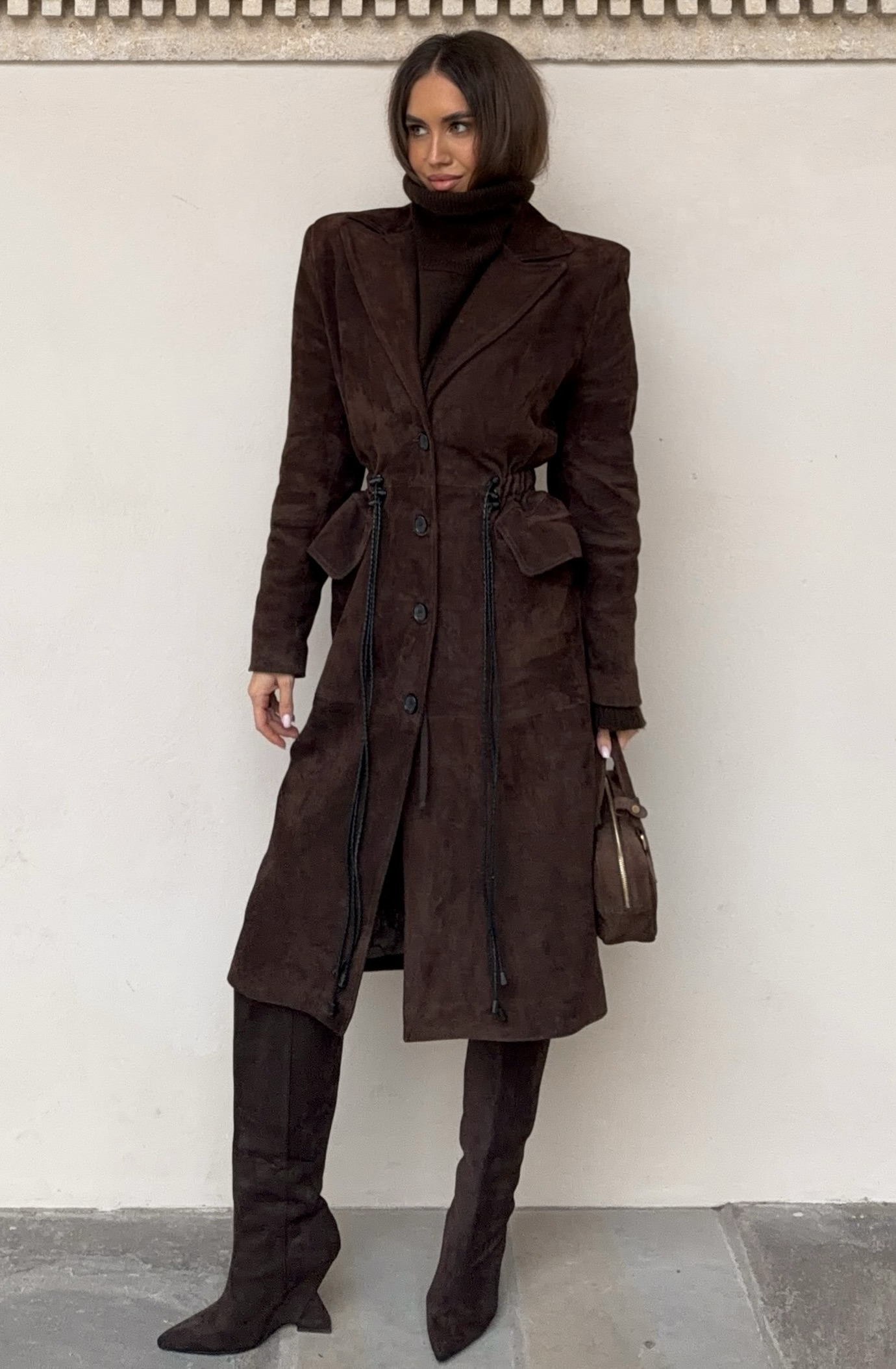 Charakterystycznym elementem płaszcza jest podniesiona linia ramion, która` dodaje mu wyrazistego wyglądu. Płaszcz dodatkowo wyposażony w regulacje skórzanych sznurków, które pozwalają na swobodne dopasowanie obwodu w talii według indywidualnych potrzeb. Sznurki nie tylko pełnią funkcję praktyczną, ale także dodają całości stylowego akcentu.
